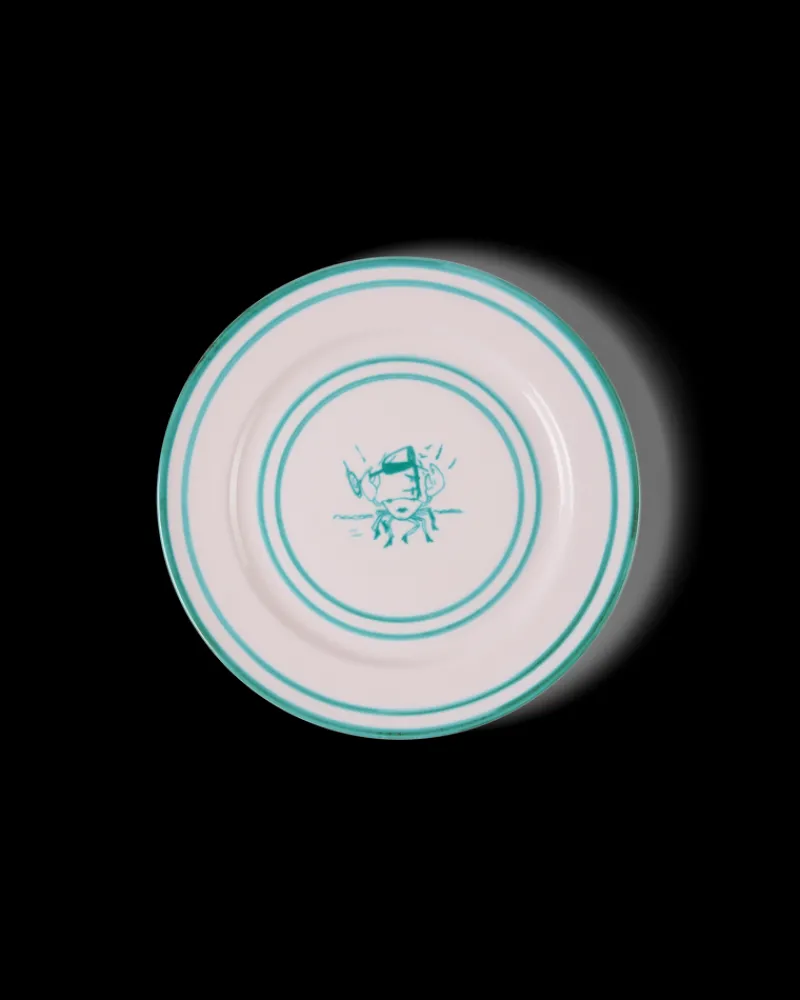 The dinner plates come in six enchanting hand-painted designs: Crab, Lips, Shrimp, Siren, Star, and Umbrella.