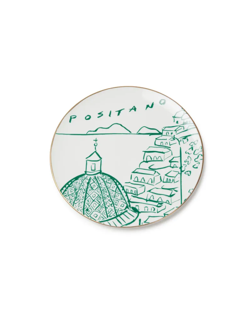 Designed exclusively for Emporio Sirenuse by world-renowned artist and interior designer, Luke Edward Hall, this elegant gold-rimmed dessert plate features an evocative brushstroke view over Positano. Painted onto a plain creamy white ground, the design is available in sophisticated tones of blue, turquoise, green or red, allowing one to create a set of matching plates or mix different colours for a more eclectic look.