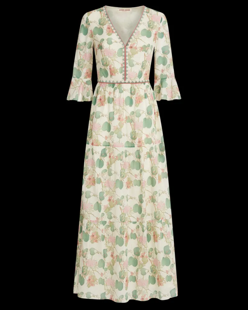 Reimagining the iconic Bella, the soft pink hues and white backgrounds of our floral Dragonfly print enhance the lightweight fabric, perfectly suited for welcoming spring. This timeless style boasts a playful tiered skirt and frilled cuffs that beautifully complement a tailored bodice, making it ideal for any occasion.