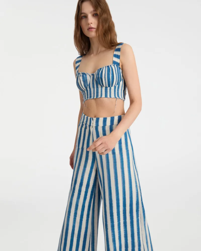 Our signature Dalia Top is a playful staple that reinvents itself with each season. Adorned with a vibrant Ikat Stripes print, this cropped bustier features romantic pleats and a uniquely deconstructed hem. The corset design, complete with an elasticized back and adjustable straps, ensures a supportive fit that beautifully enhances any bust. Pair it with the matching Adele Trousers for a coordinated look, or wear it with your favorite denim for an effortless chic outfit.