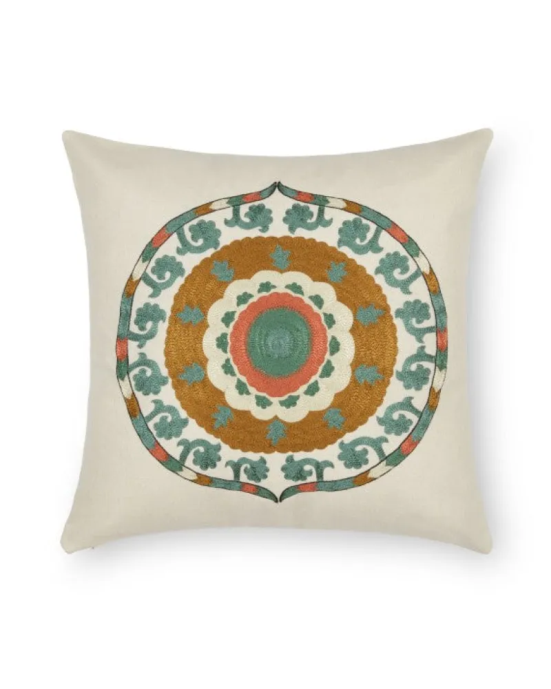 Inspired by the heirloom tradition of Suzani embroidery from Central Asia, this contemporary rendition of the ancestral circle designs evokes the beauty of abundance and cyclical return of the seasons. The perfect gift or collector’s piece, mix and match our cushions to add a luxuriant colour accent to a sofa, bed, bay window or terrace.